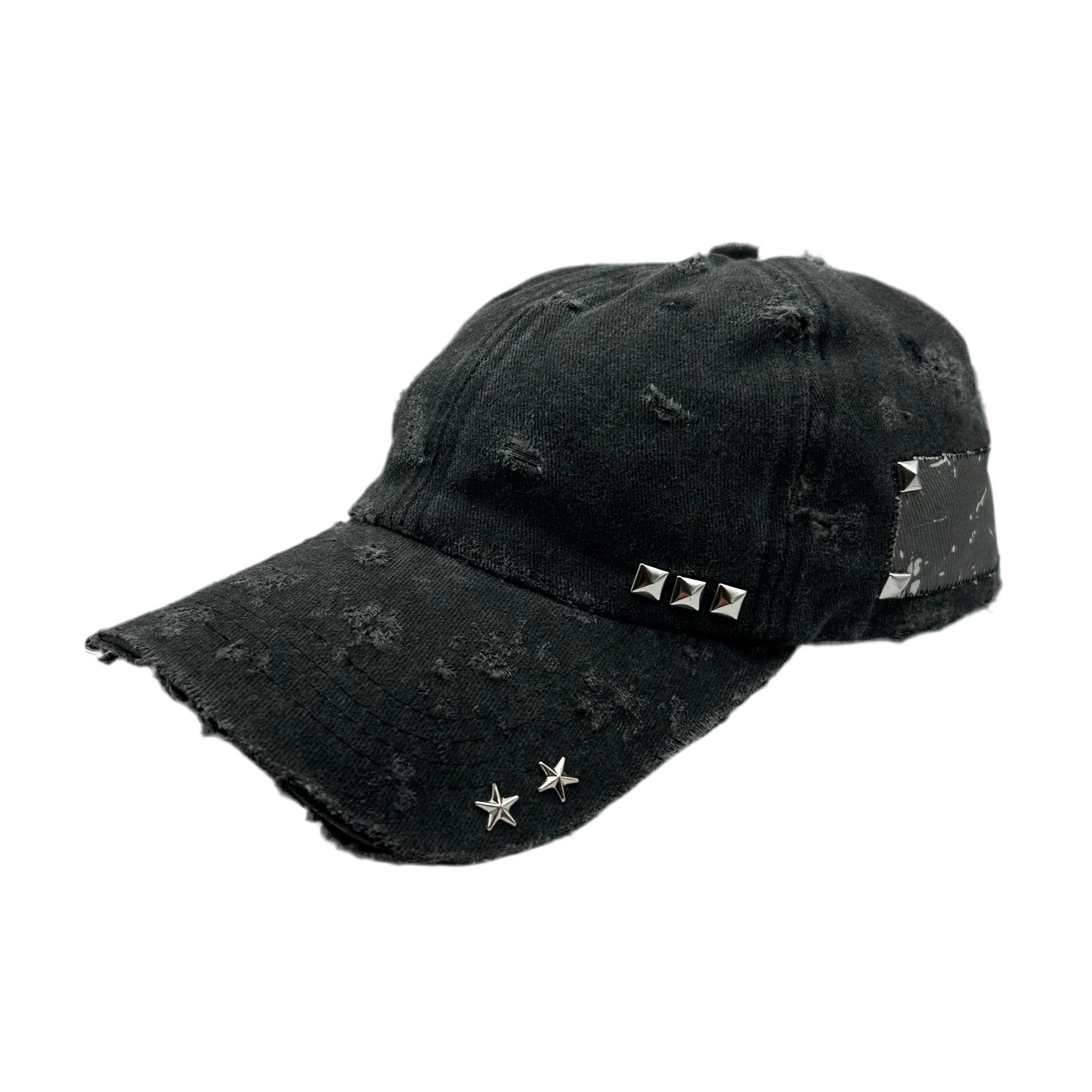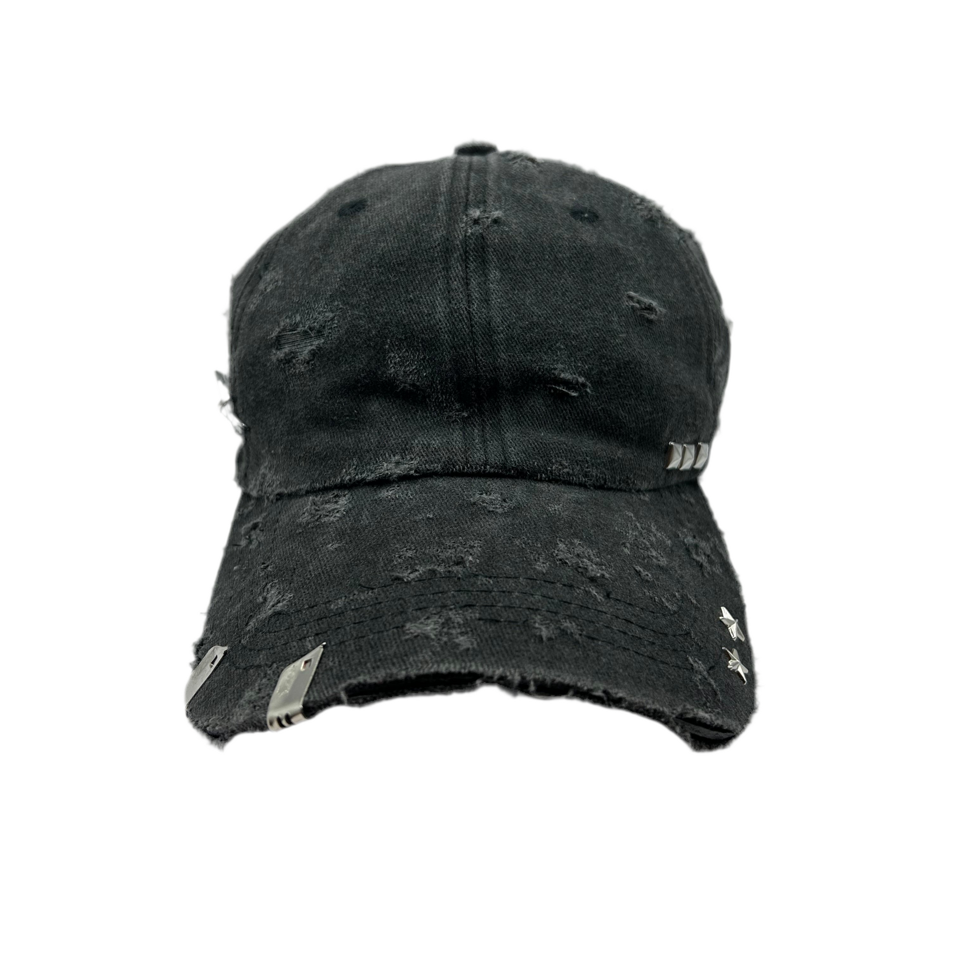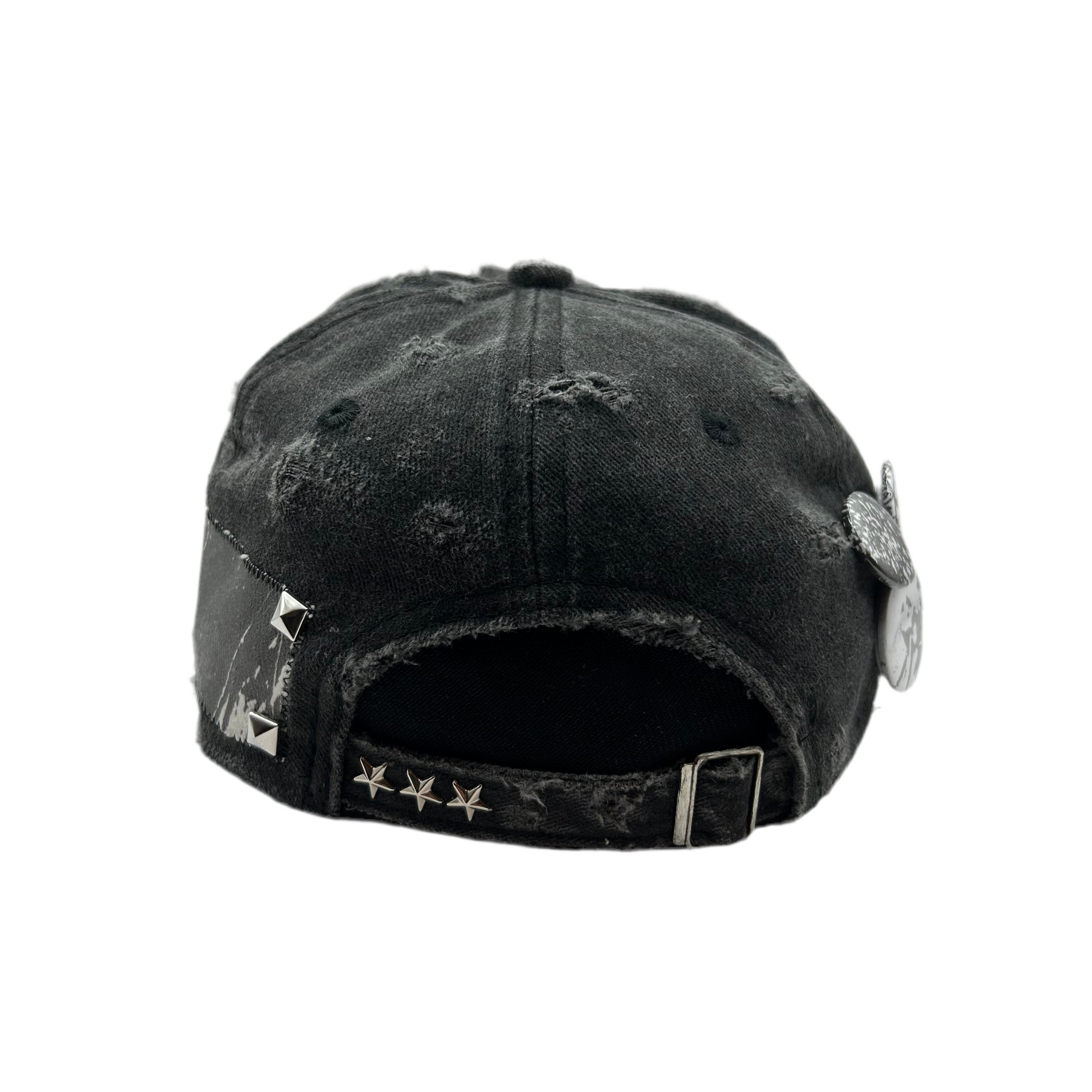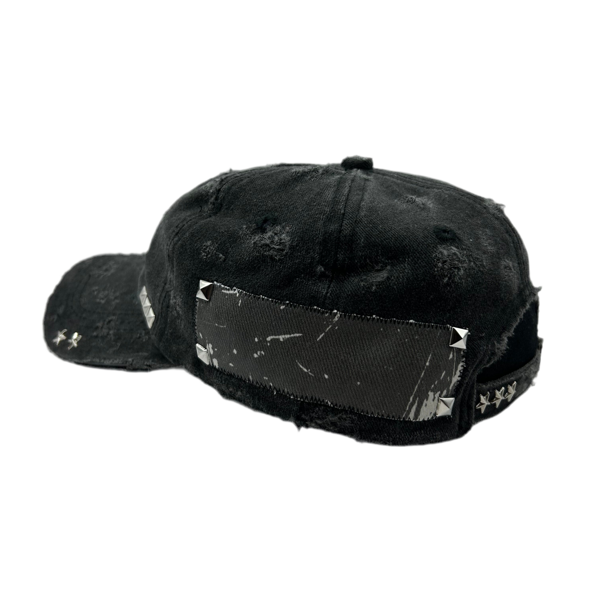 - Washed Black Baseball Cap with Original Patches, Pins and Custom Distressing and Rivet Work