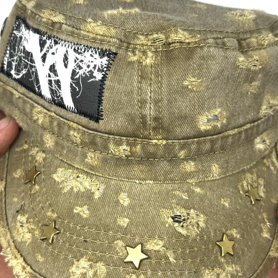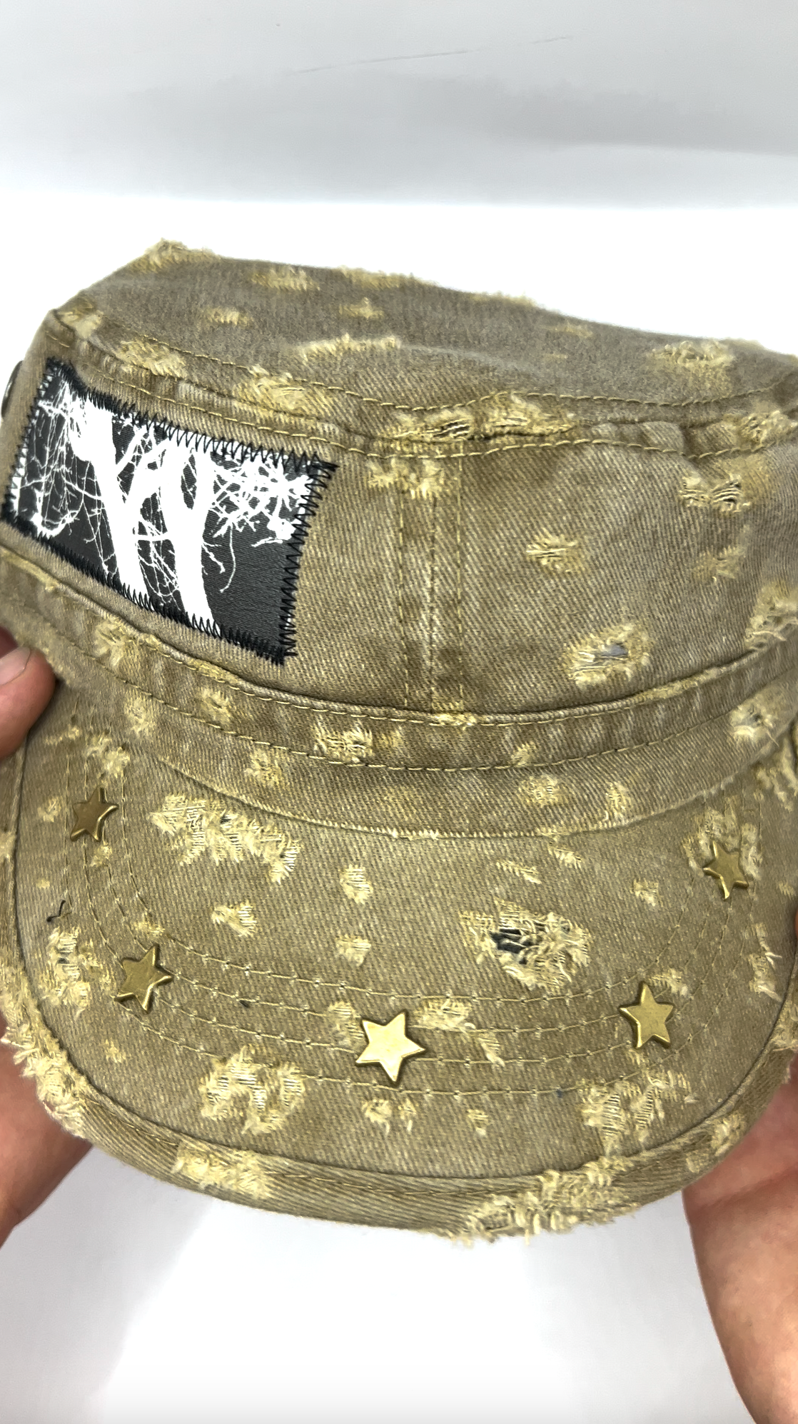 - Distressed Beige Military Cap with Custom Patches, Pins and Rivet Work