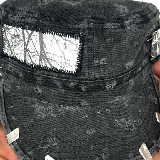 - Distressed Washed Black Military Cap with Custom Patches, Pins, Stitch and Rivet Work