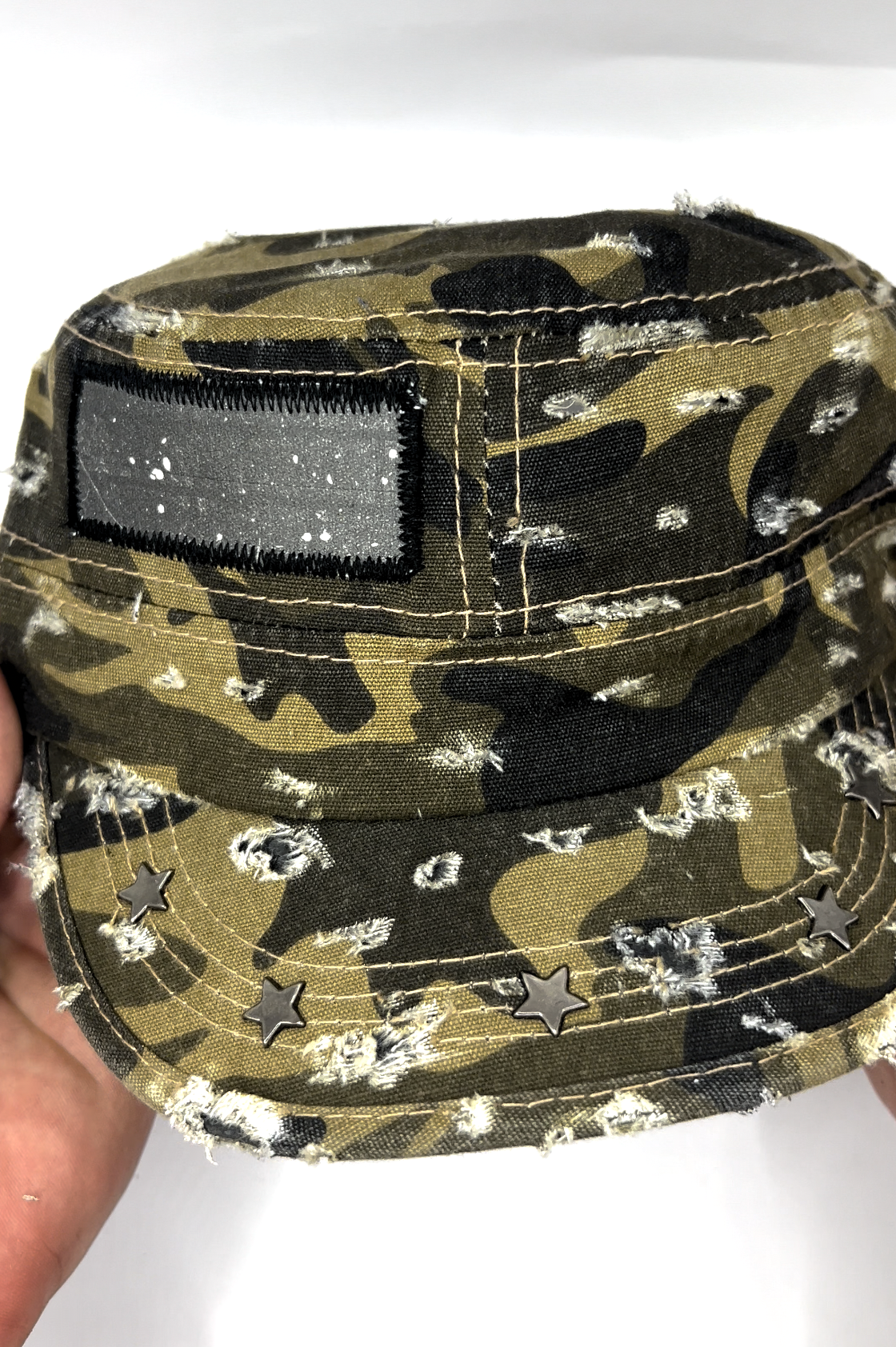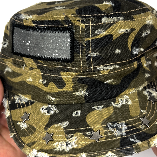 - Distressed Beige Camouflage Military Cap with Custom Patches, Pins and Rivet Work