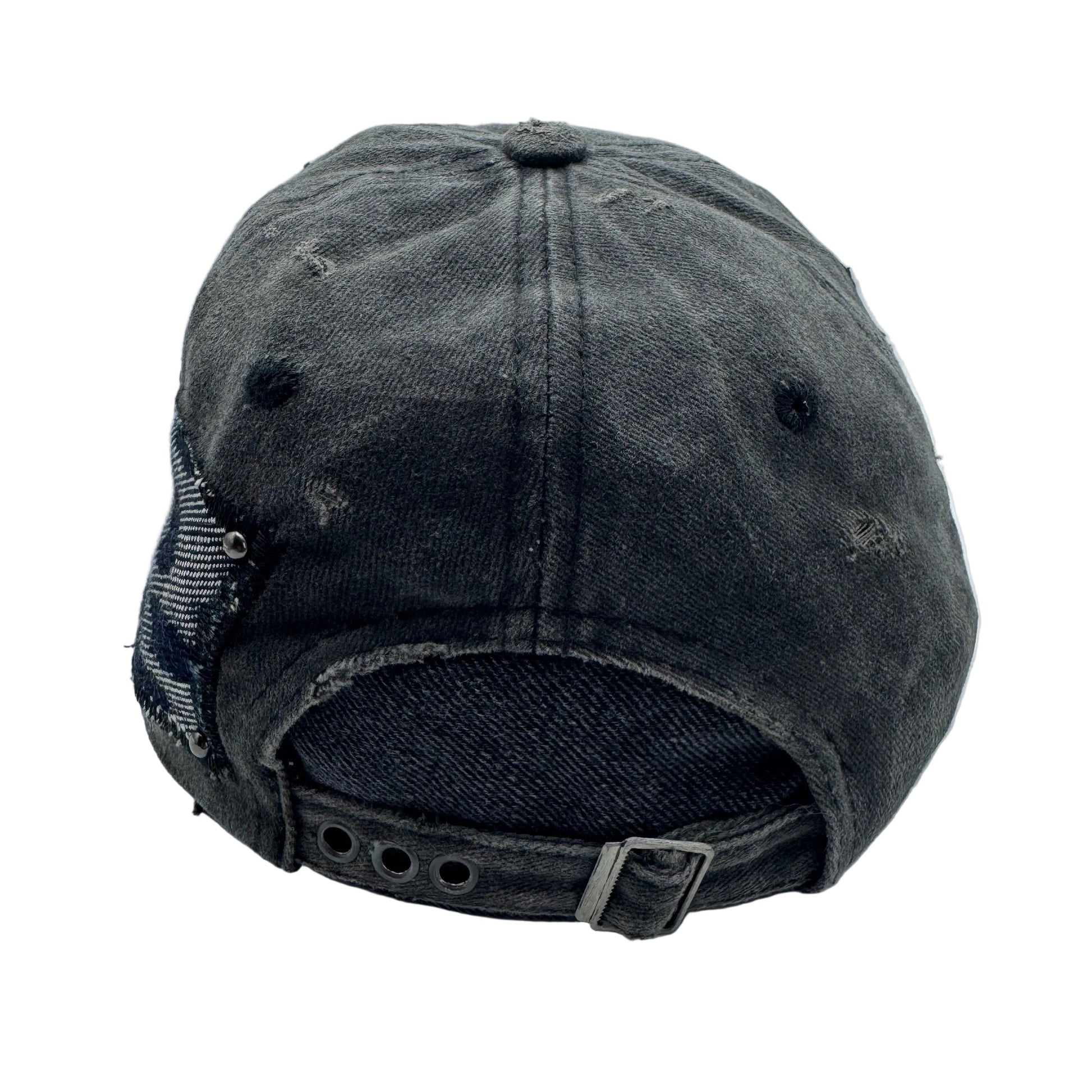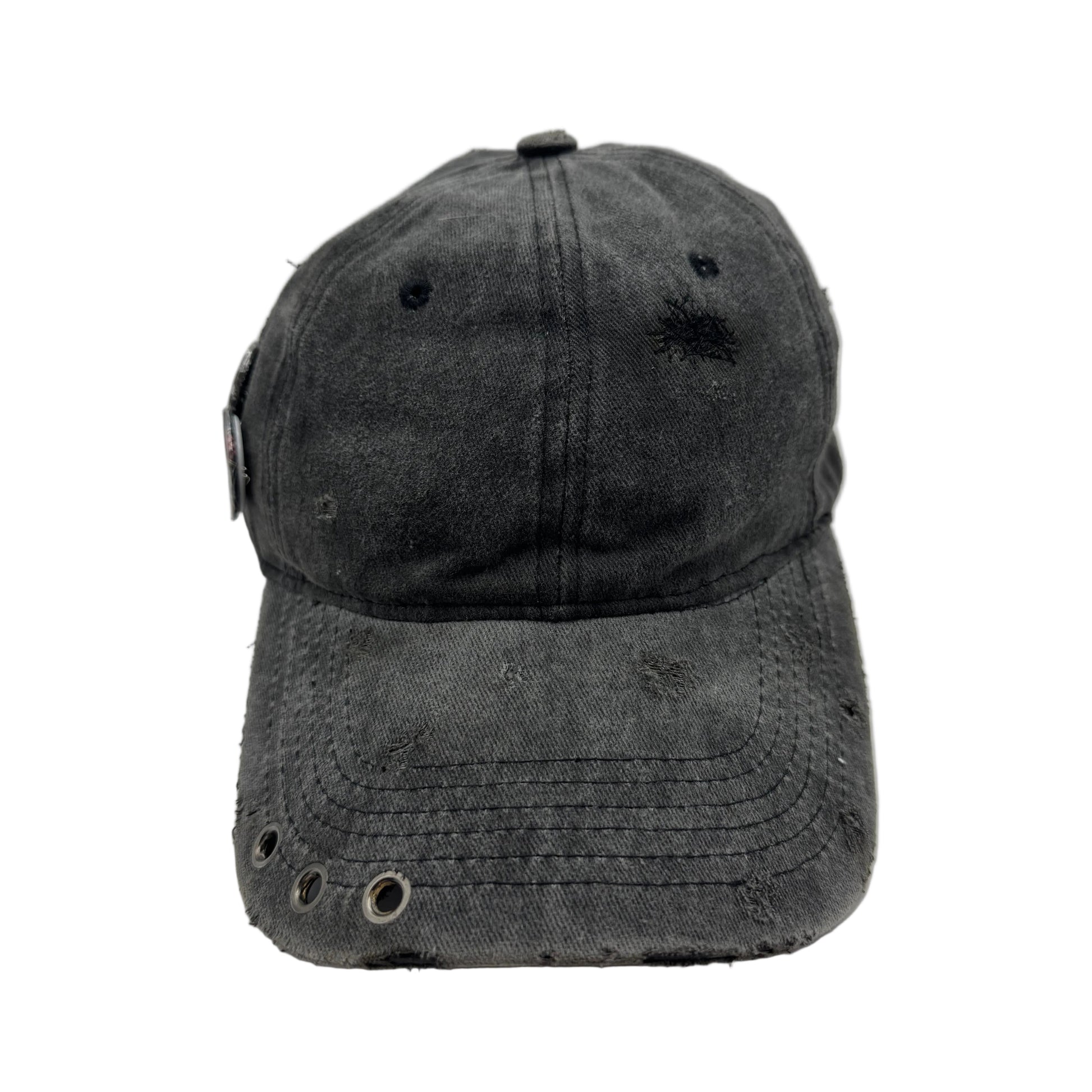 riveted patch, eyelet rivets, pins, layered stitching, distress